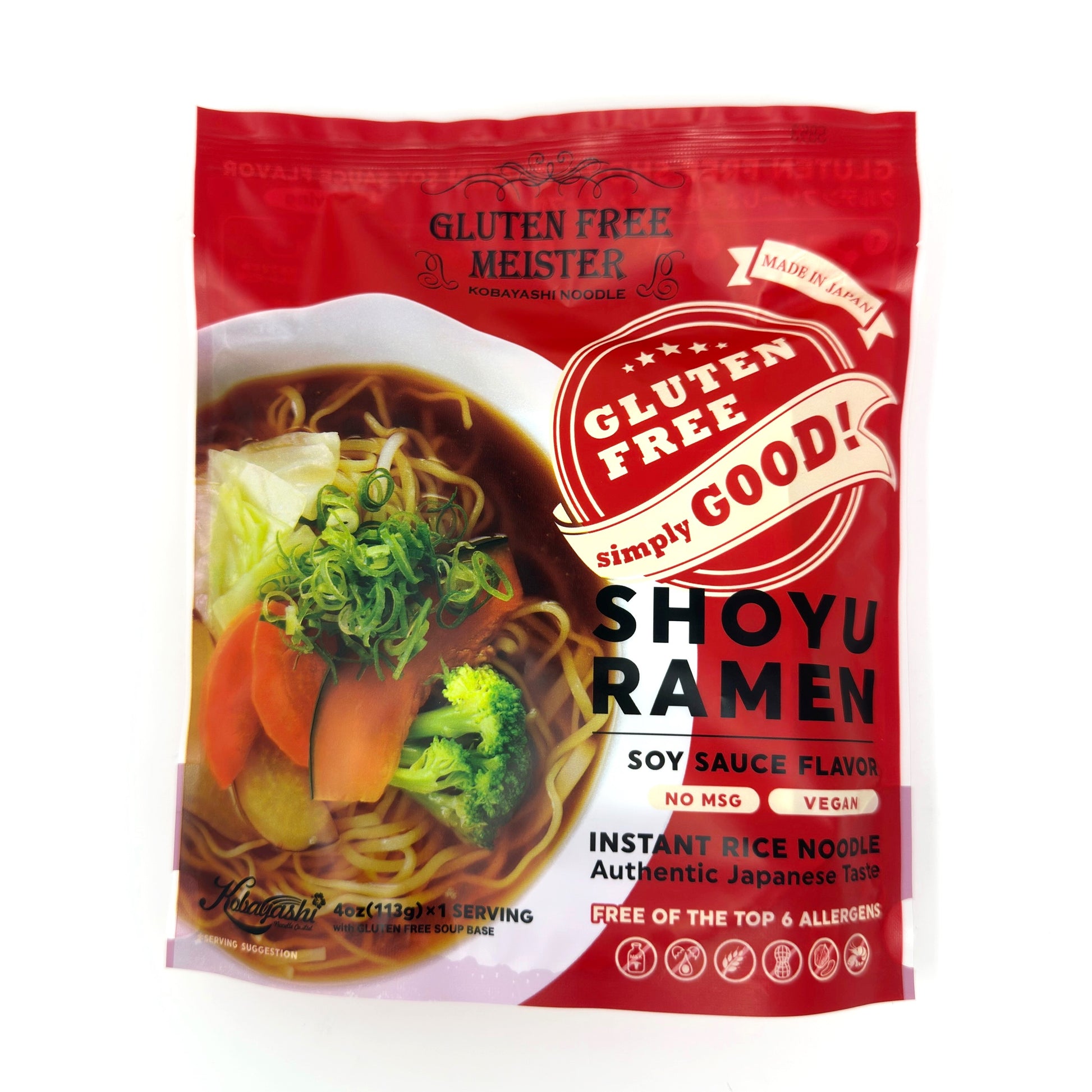 Shoyu (Soy Sauce) Ramen is one of the most popular ramen in Japan and now you can enjoy a tasty Gluten Free ramen safely with confidence! The noodles (rice-based) and soup base are both gluten free. Our Shoyu Ramen has a clear vegan brown broth made with gluten free soy sauce. Our Gluten Free instant rice noodle offers authentic Japanese flavor and texture. This Gluten Free Shoyu Ramen comes with a concentrated liquid soup base which contains no MSG, vegan, and free of the top 6 allergens (free of egg, dairy, wheat, peanuts, tree nuts, shell fish). Noodles are made of non-GMO Japanese rice flour and is free of the top 8 allergens (vegan).  Manufactured in an ISO 9001-certified Gluten Free factory in Japan.